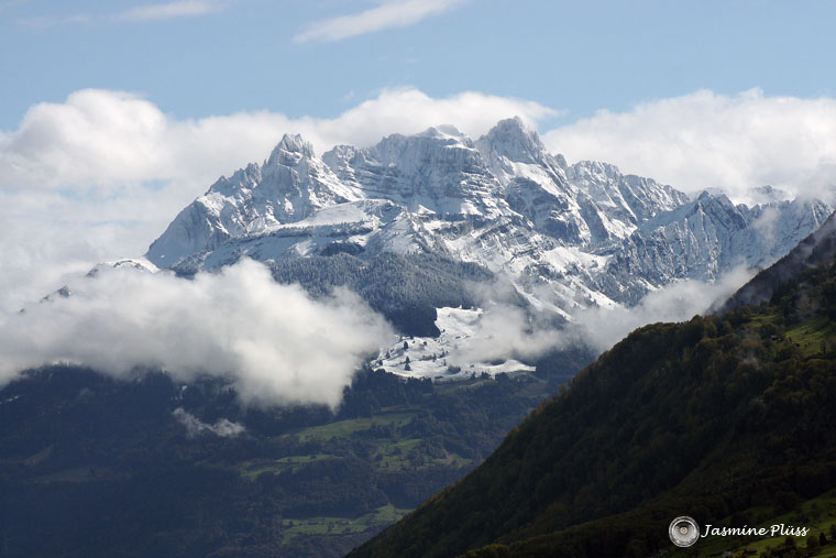 Text: Mürtschenstock mit Nebelwolken