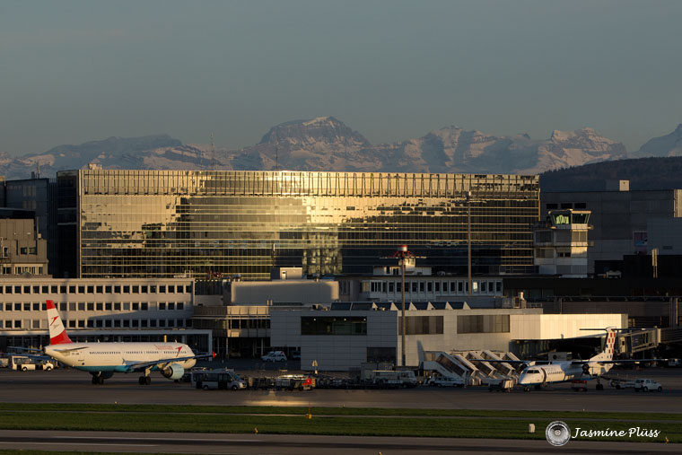 Text: Flughafen Zürich mit SAS Radison im Abendlicht